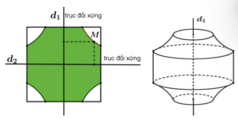 Có một hình phẳng (H) (phần tô đậm trong hình vẽ bên) được tạo ra bằng cách vẽ một hình vuông có cạnh bằng 4. Sau đó, ở bốn góc hình vuông đó vẽ bốn đường cong đều có tính chất là: tích khoảng cách từ một điểm bất kì thuộc mỗi đường cong đó đến hai trục đối xứng $d_1, d_2$ của hình vuông bằng 2. Khi cho hình phẳng (H) quay quanh trục $d_1$ ta sẽ thu được một vật thể tròn xoay, thể tích vật thể tròn xoay đó bằng bao nhiêu (không làm tròn kết quả các phép tính trung gian, chỉ làm tròn kết quả cuối cùng đến hàng phần chục)?