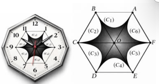 Trong hình bên là một chiếc đồng hồ treo tường cao cấp được thiết kế có phần ở giữa (phần tô đậm) dát vàng. Phần này được thiết kế như sau: Vẽ hình lục giác đều ABCDEF tâm O và có cạnh bằng 4cm; Vẽ parabol $(C_1)$ tiếp xúc với các đường thẳng OA, OB lần lượt tại A và B; Tương tự vẽ parabol $(C_2)$ tiếp xúc với các đường thẳng OB, OC lần lượt tại B và C parabol $(C_3)$ tiếp xúc với các đường thẳng OC, OD lần lượt tại C và D; ...; parabol $(C_6)$ tiếp xúc với các đường thẳng OF, OA lần lượt tại F và A. Hình phẳng (H) được giới hạn bởi sáu parabol $(C_1), (C_2), (C_3), (C_4), (C_5), (C_6)$ (phần tô đậm) là phần sẽ được dát vàng. Hỏi phần dát vàng này có diện tích bằng bao nhiêu centimet vuông (không làm tròn kết quả các phép tính trung gian, chỉ làm tròn kết quả cuối cùng đến hàng phần chục)?