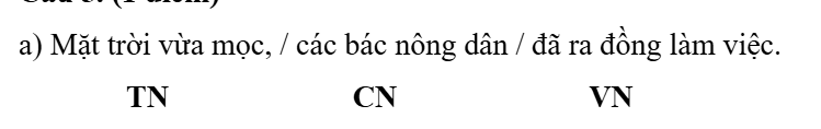 Em hãy xác định các thành phần câu và ghi “TN” dưới trạng ngữ, “CN” dưới chủ ngữ, “VN” dưới vị ngữ: a) Mặt trời vừa mọc, các bác nông dân đã ra đồng làm việc.