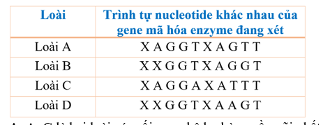 Cho biết gene mã hóa cùng một loại enzyme ở một số loài chỉ khác nhau ở trình tự nucleotide sau đây: Phân tích bảng dữ liệu trên, có thể dự đoán về mối quan hệ họ hàng giữa các loài trên là.