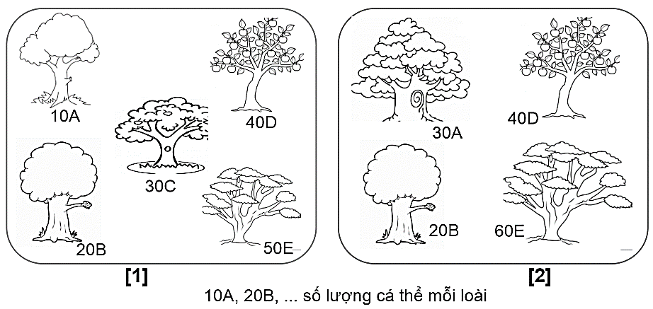 Sơ đồ minh hoạ 2 quần xã sinh vật [1] và [2]. Kết luận nào sau đây đúng? Độ phong phú trung bình của quần xã [2] gấp bao nhiêu lần so với quần xã [1]?
