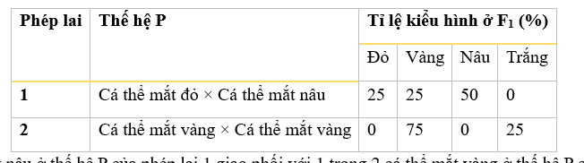 Một loài động vật, tính trạng màu mắt được quy định bởi 1 gene nằm trên NST thường có 4 allele, các allele trội là trội hoàn toàn. Tiến hành các phép lai sau: Cho cá thể mắt nâu ở thế hệ P của phép lai 1 giao phối với 1 trong 2 cá thể mắt vàng ở thế hệ P của phép lai 2, thu được đời con. Theo lí thuyết, đời con có thể có tỉ lệ