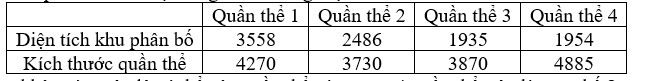 Giả sử kết quả khảo sát về diện tích khu phân bố (tính theo m2) và kích thước quần thể (tính theo số lượng cá thể) của 4 quần thể sinh vật cùng loài ở cùng một thời điểm như sau: