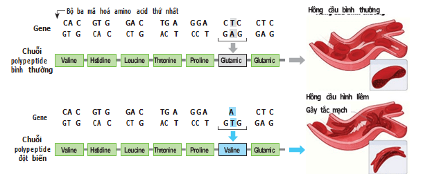 Hình dưới đây mô tả cơ chế phân tử của bệnh hồng cầu hình liềm. Quan sát hình bên dưới và cho biết mỗi phát biểu sau đây Đúng hay Sai khi nói về đột biến hồng cầu hình liềm?