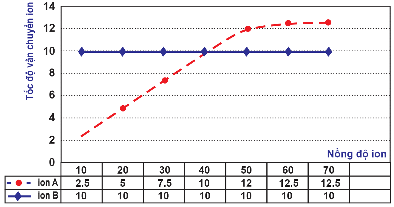 Hình biểu thị kết quả nghiên cứu hình thức vận chuyển của ion A và B qua màng tế bào.