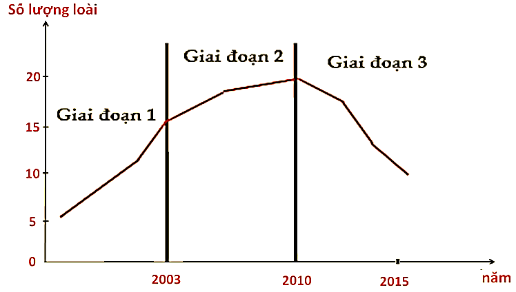 Trong một khu rừng nhiệt đới, một đám cháy nhỏ đã làm chết các cây thân gỗ, tạo ra một khoảng trống có diện tích khoảng 5000m2. Các nhà khoa học đã khoanh vùng khu vực này không cho động vật xâm nhập và tiến hành nghiên cứu sự thay đổi số lượng loài thực vật trong khu vực theo thời gian, bắt đầu từ sau khi kết thúc cháy rừng. Kết quả nghiên cứu được mô tả trong đồ thị sau: Hãy cho biết, phát biểu nào dưới đây không đúng? I. Số lượng loài thực vật tăng dần theo thời gian nghiên cứu. II. Ở giai đoạn 1, ổ sinh thái của các loài thực vật có xu hướng mở rộng. III. Ở giai đoạn 2, mức độ cạnh tranh giữa các loài ngày càng gay gắt. IV. Ở giai đoạn 3, một vài loài thực vật phát triển quá mạnh làm ức chế sự phát triển của loài khác.