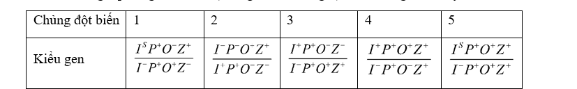 Ở vi khuẩn E. coli kiểu dại, sự biểu hiện của gen lacZ thuộc operon Lac mã hóa enzim β-galactosidase phụ thuộc vào sự có mặt của glucose và lactose trong môi trường. Khi môi trường có cả glucose và lactose, enzim này biểu hiện ở mức thấp trong các tế bào vi khuẩn kiểu dại. Khi môi trường chỉ có lactose, enzim được biểu hiện ở mức tăng cường trong các tế bào vi khuẩn kiểu dại. Bằng kỹ thuật gây đột biến và chuyển DNA plasmid mang các trình tự gen có nguồn gốc từ E. coli này vào các tế bào E. coli khác, người ta đã tạo được 5 chủng vi khuẩn đột biến có kiểu gen lưỡng bội về các gen và trình tự điều hòa tham gia phân giải lactose (chủng 1 đến chủng 5) như ở bảng dưới đây. Trong đó: I+, P+, O+, Z+ tương ứng là các trình tự kiểu dại của gen mã hóa protein ức chế (I), vùng khởi động (P), vùng vận hành (O) và gen lacZ; P−, O−, Z− là các trình tự đột biến mất chức năng so với trình tự kiểu dại tương ứng; I− là đột biến làm protein ức chế mất khả năng gắn vùng vận hành; IS là đột biến làm protein ức chế mất khả năng gắn vào đồng phân của lactose. Mức biểu hiện enzim β-galactosidase của 5 chủng đột biến này trong các điều kiện môi trường sau: