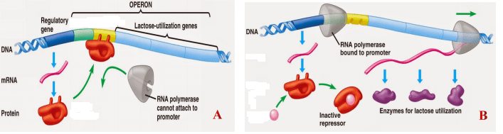 a) A: trong môi trường có lactose, B: trong môi trường không có lactose.