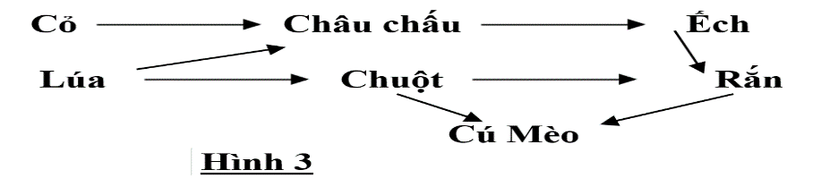 Hình 3 là một lưới thức ăn trong một đồng ruộng. Biết rằng sản lượng của Cỏ và Lúa lần lượt 200 và 400 Kcal/ mùa/1000m2. Hiệu suất của mỗi loại thức ăn tương ứng lá 10%. Sản lượng của Rắn tương đướng thu được là bao nhiêu ? (Viết kết quả bằng số thập phân)