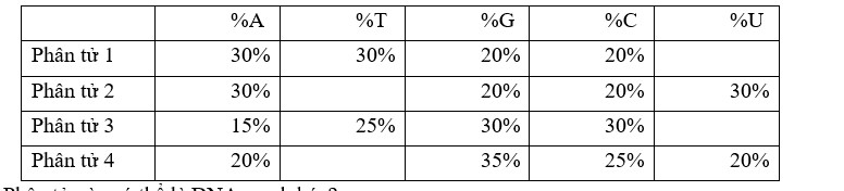 Phân tích thành phần của 4 nucleic acid thu được từ 4 đối tượng sinh học để nghiên cứu người ta thấy tỉ lệ các loại nucleotide của các phân tử Nucleic acid này như sau:
