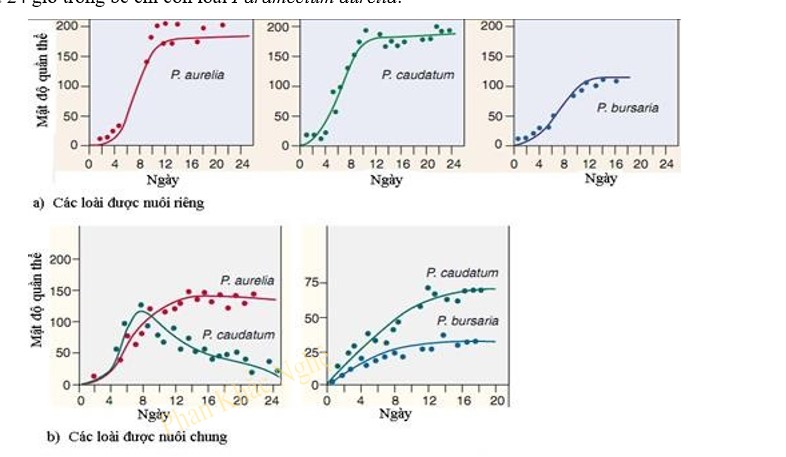 Khi nghiên cứu mối quan hệ sinh thái giữa các loài có quan hệ gần gũi, nhà khoa học Gause đã tiến hành nuôi 3 loài trùng cỏ: Paramecium aurelia, Paramecium bursaria, Paramecium caudatum có cùng nhu cầu dinh dưỡng và các nhân tố sinh thái cần thiết. Thí nghiệm được tiến hành như sau: - Thí nghiệm 1: Nuôi riêng mỗi loài trong một bể, cả 3 loài cùng tăng trưởng ổn định theo đường cong hình chữ S (đường cong logistic). - Thí nghiệm 2: Nuôi chung loài Paramecium aurelia và loài Paramecium caudatum trong 1 bể: kết quả sau 24 giờ trong bể chỉ còn loài Paramecium aurelia. - Thí nghiệm 3: Nuôi chung loài Paramecium bursaria và loài Paramecium aurelia trong 1 bể: kết quả sau một thời gian 2 loài vẫn cùng sinh trưởng với nhau trong bể.