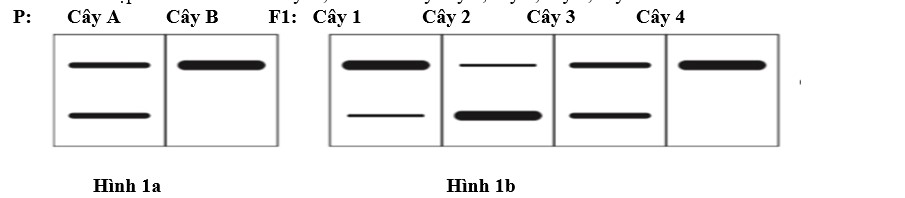 Hình 1a: Kết quả điện di mtDNA từ lá cây A và cây B. Hình 1b: Kết quả điện di mtDNA từ 4 chiếc lá cây 1, cây 2, cây 3, cây 4. Kết quả thu được như hình 1. Các nhận định sau đúng hay sai?