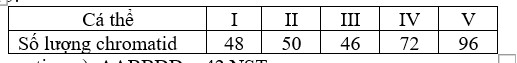 Một loài thực vật, bộ NST cơ thể (2n) có 12 nhóm gene liên kết. Bằng phương pháp tế bào học người ta xác định được số lượng chromatid của 5 cá thể thuộc loài trên ở kì giữa các tế bào đang nguyên phân thể hiện ở Bảng 5.