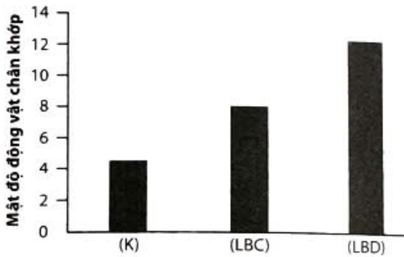 Một loài động vật chân khớp ăn lá cây, trong khi chúng là thức ăn của chim và dơi. Nhằm kiểm tra tác động của chim và dơi đến loài động vật này trong khu rừng, ba thí nghiệm đã được tiến hành: - Thí nghiệm 1: cây không được che chắn (K). - Thí nghiệm 2: cây được che chắn để loại bỏ tác động của chim (LBC). - Thí nghiệm 3: cây được che chắn để loại bỏ tác động của dơi (LBD). Theo dõi mật độ cá thể của các động vật chân khớp (cá thể/m2 lá) của ba thí nghiệm thu được kết quả như biểu đồ Hình 15.9.