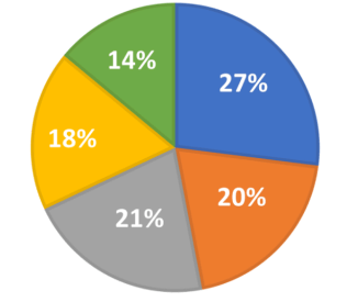 Tủ sách Toán - Khoa học của một thư viện có một số quyển sách bao gồm các môn: Toán, Vật lý, Hóa học, Sinh học, Tin học. Tỉ lệ số sách theo môn được thể hiện qua biểu đồ: Toán 27%, Vật lý 20%, Hóa học 21%, Sinh học 18%, Tin học 14%. Lấy ngẫu nhiên một quyển sách trong tủ sách đó. Xác suất để quyển sách lấy được không phải sách Sinh học là:
