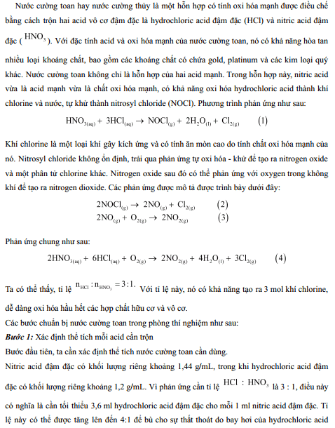 Cho các phát biểu sau: (1) Nước cường toan cũng được sử dụng trong phòng thí nghiệm để làm sạch dụng cụ thí nghiệm bằng thủy tinh. (2) Khi bị cường toan tiếp xúc với da, hãy trung hòa bằng dung dịch sodium hydroxide và rửa lại nhiều lần với nước. (3) Có thể bảo quản nước cường toan trong thời gian dài. (4) Nước cường toan được sử dụng để tinh chế một số kim loại quý như gold, platinum. Số phát biểu đúng là: