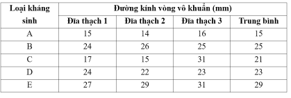 Một người bị nhiễm khuẩn, điều trị trong bệnh viện, bác sĩ làm kháng sinh đồ và cho kết quả ở bảng sau: