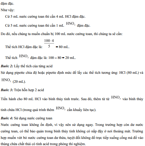 Tỉ lệ về thể tích của hydrochloric acid đậm đặc và nitric acid đậm đặc cần dùng để pha chế nước cường toan là _______.