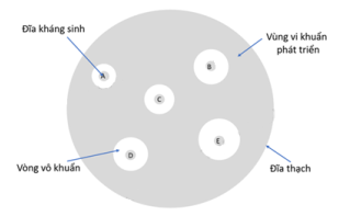 Đọc văn bản sau và trả lời các câu hỏi: Để tăng hiệu quả điều trị và giảm thiểu nguy cơ kháng kháng sinh trong điều trị nhiễm khuẩn, bác sĩ sử dụng phương pháp thử và tìm loại kháng sinh hiệu quả nhất với loại vi khuẩn mà người bệnh đang nhiễm, phương pháp này được gọi là kháng sinh đồ. Quy trình thực hiện gồm các bước như sau:Lấy mẫu bệnh phẩm có chứa vi khuẩn của người bệnh.Cấy vi khuẩn thu được lên 3 đĩa thạch dinh dưỡng.Bác sĩ xác định các loại thuốc kháng sinh có thể được dùng để điều trị.Sử dụng giấy thấm các loại thuốc kháng sinh với nồng độ đã xác định.Đặt giấy thấm lên đĩa thạch với khoảng cách đều nhau.Để trong tủ ủ ấm trong $24 – 48\text{h}$.Đo đường kính của từng vòng vô khuẩn (như minh họa trong hình dưới).