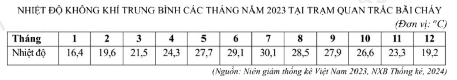 Căn cứ vào bảng số liệu trên, hãy cho biết nhiệt độ không khí trung bình năm 2023 tại trạm quan trắc Bãi Cháy là bao nhiêu °C (làm tròn kết quả đến một chữ số thập phân).