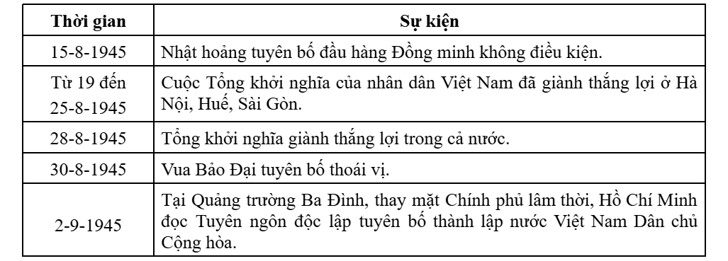 Cho bảng dữ kiện về Tổng khởi nghĩa tháng Tám năm 1945 ở Việt Nam: