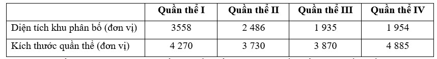 Giả sử kết quả khảo sát về diện tích khu phân bố (tính theo mỏ) và kích thước quần thể (tính theo số lượng cá thể) của 4 quần thể sinh vật cùng loài ở cùng một thời điểm như sau: