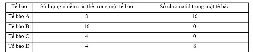 Ở ruồi giấm 2n = 8. Quan sát quá trình phân bào của 4 tế bào A, B, C, D thuộc loài này người ta thu được số liệu như bảng sau:
