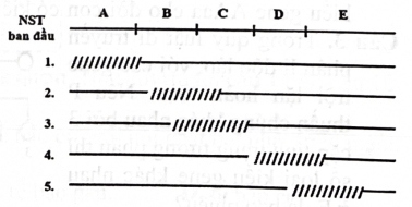 Các trình tự một operon ở vi khuẩn E. coli nằm trong đoạn NST được kí hiệu ban đầu từ A đến E. Để xác định các trình tự của operon này, người ta sử dụng 5 trường hợp đột biến mất đoạn như hình bên (các đường gạch chéo biểu hiện đoạn bị mất). Kết quả thu được trường hợp 4 và 5 có các gene cấu trúc luôn được phiên mã; trường hợp 2 và 3 có các gene cấu trúc luôn không được phiên mã; trường hợp 1 chưa xác định được mức biểu hiện của các gene cấu trúc trong operon. Trong các phát biểu sau, các phát biểu về trình tự operon trên đúng hay sai?