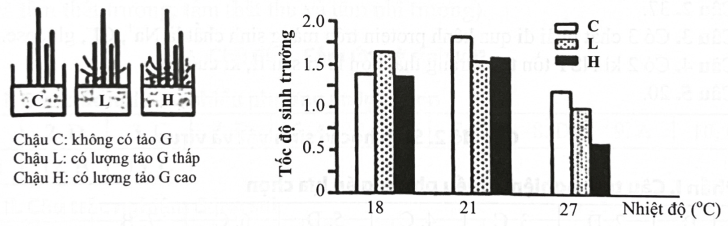 Loài rong X sống ở vùng biển ven bờ Z, nơi có nhiệt độ mùa hè hiếm khi cao hơn 18 °C. Thực hiện thí nghiệm nuôi loài rong X trong 3 chậu nuôi (hình a), ở 3 điều kiện nhiệt độ: 18 °C, 21 °C, 27 °C, người ta thu được kết quả ở hình b.