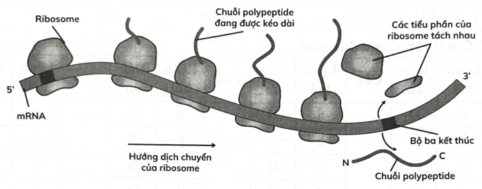 Hình dưới đây thể hiện quá trình dịch mã của nhiều ribosome tham gia vào quá trình tổng hợp protein. Theo lí thuyết, có bao nhiêu chuỗi polypeptide được tạo thành theo sơ đồ này?