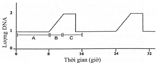 Đồ thị dưới đây mô tả sự thay đổi lượng DNA của một tế bào trong chu kì tế bào ở một loại tế bào mô phân sinh thực vật. Giai đoạn B trong đồ thị tương ứng là