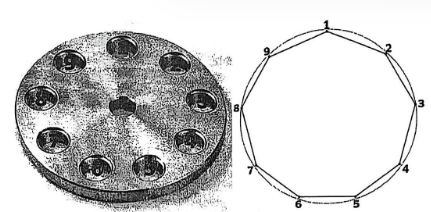 Một kỹ sư tiến hành lắp ráp một rotor của động cơ phản lực. Rotor có 9 khe cắm cánh quạt được đánh số cố định từ 1 đến 9 theo vòng tròn (như hình vẽ). Khoảng cách giữa các khe đều nhau, tạo thành các đỉnh của một đa giác đều có 9 cạnh. Do sai số chế tạo, 9 cánh quạt có khối lượng thực tế là các số nguyên phân biệt từ $1\text{ gam}$ đến $9\text{ gam}$. Để đảm bảo rotor cân bằng động học khi quay, kỹ sư lựa chọn phương án lắp đặt thỏa mãn đồng thời các điều kiện sau:Chia 9 cánh quạt thành 3 nhóm (mỗi nhóm 3 cánh).Mỗi nhóm được lắp vào 3 khe cắm tạo thành một tam giác đều (ba khe cắm tạo thành một tam giác đều khi và chỉ khi chúng cách nhau đúng 3 khe theo vòng tròn).Tổng khối lượng của 3 cánh quạt trong mỗi nhóm phải bằng nhau.Hỏi có bao nhiêu cách sắp xếp 9 cánh quạt vào 9 khe cắm thỏa mãn các điều kiện kỹ thuật trên? (Hai cách sắp xếp được coi là khác nhau nếu có ít nhất một cánh quạt ở một vị trí khe cắm khác nhau, không đồng nhất các cách lắp khác nhau bởi phép quay hay phép đối xứng của rotor).