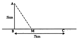 Một chiếc thuyền ở vị trí $A$ cách bờ biển một khoảng $AB$ bằng 5 km. Trên bờ biển có một cái kho ở vị trí $C$ cách $B$ một khoảng là 7 km. Người lái thuyền dự định chèo thuyền từ $A$ đến điểm $M$ trên bờ biển với vận tốc $1,2$ $\text{m/s}$ rồi đi bộ đến $C$ với vận tốc $1,8$ $\text{m/s}$ (xem hình vẽ dưới đây). Điểm $M$ cách $B$ bao nhiêu km để người đó đến kho nhanh nhất?