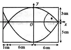 Họa sĩ thiết kế logo hình con cá cho một doanh nghiệp kinh doanh hải sản. Logo là hình phẳng giới hạn bởi hai parabol với các kích thước được cho trong hình (đơn vị trên mỗi trục tọa độ là cm). Diện tích logo bằng bao nhiêu $\text{cm}^2$ (không làm tròn kết quả các phép tính trung gian, chỉ làm tròn kết quả cuối cùng)?