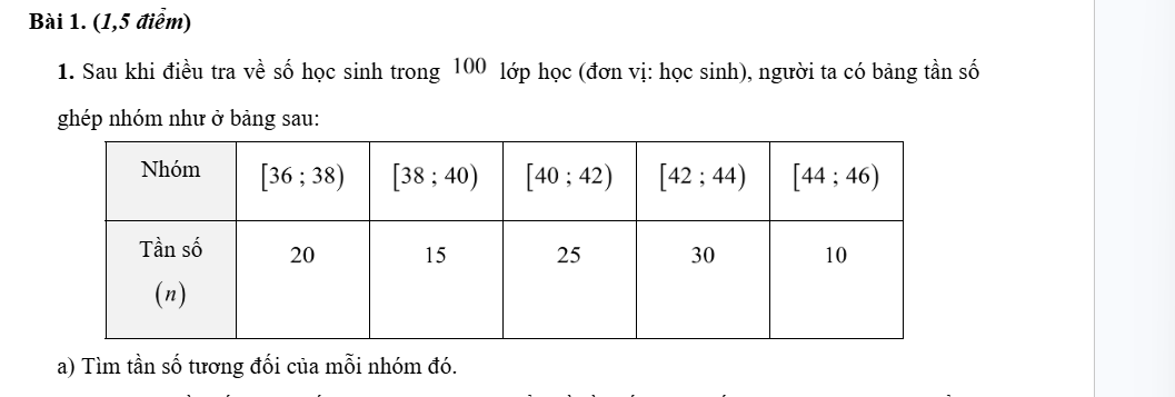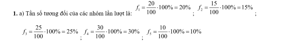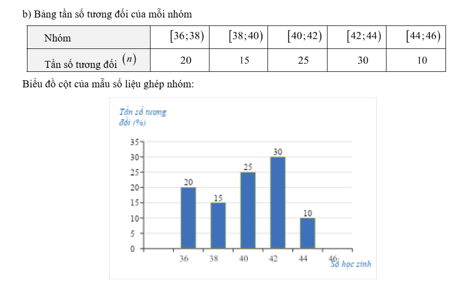 b) Lập bảng tần số tương đối ghép nhóm và vẽ biểu đồ tần số tương đối ghép nhóm ở dạng biểu đồ cột của mẫu số liệu ghép nhóm đó.
