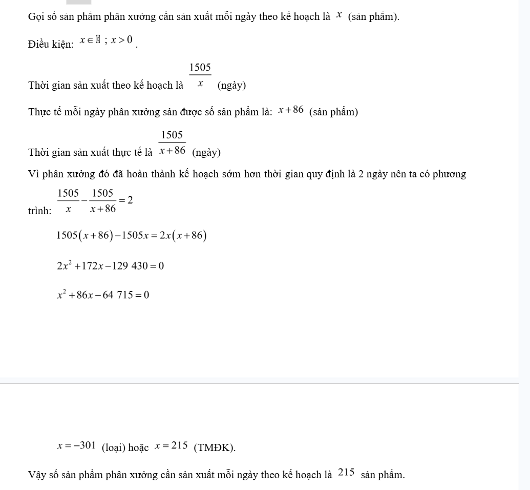 Một phân xưởng theo kế hoạch cần sản xuất 1505 sản phẩm trong một số ngày quy định. Do mỗi ngày phân xưởng đó vượt mức sản phẩm nên phân xưởng đó đã hoàn thành kế hoạch sớm hơn thời gian quy định là 2 ngày. Hỏi theo kế hoạch thì mỗi ngày phân xưởng đó cần sản xuất bao nhiêu sản phẩm?