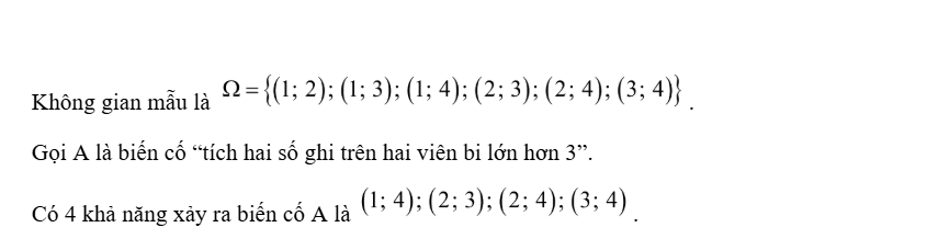 Một túi đựng 4 viên bi có cùng khối lượng và kích thước, được đánh số 1; 2; 3; 4. Lấy ngẫu nhiên hai viên bi từ trong túi. Số khả năng xảy ra của biến cố A là