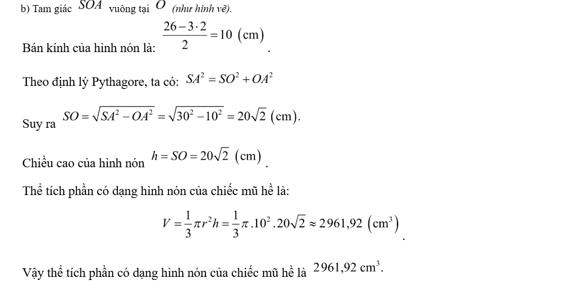 b) Hỏi thể tích phần có dạng hình nón của chiếc mũ chú hề ở Hình b bằng bao nhiêu centimét khối (làm tròn kết quả đến hàng phần trăm).