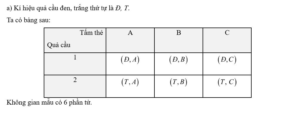 Bạn Hoàng lấy ngẫu nhiên một quả cầu từ một túi đựng 2 quả cầu gồm một quả màu đen và một quả cầu màu trắng, có cùng khối lượng và kích thước. Bạn Hải rút ngẫu nhiên một tấm thẻ từ một hộp đựng 3 tấm thẻ A, B, C. a) Mô tả không gian mẫu của phép thử.