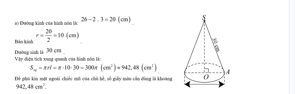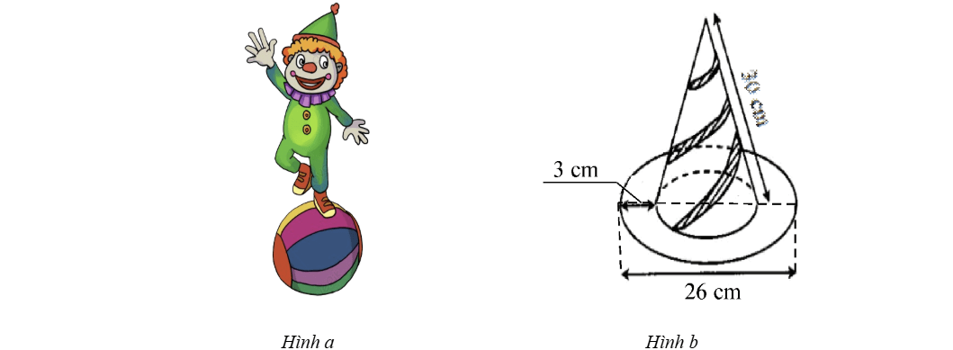 Chú Hề trên sân khấu thường có trang phục như Hình a. Mũ của chú Hề có dạng hình nón. Có thể mô phỏng cấu tạo, kích thước chiếc mũ của chú Hề như Hình b. a) Để phủ kín mặt ngoài của chiếc mũ của chú Hề như Hình b cần bao nhiêu cemtimet vuông giấy màu (không tính phần mép dán, làm tròn kết quả đến hàng phần trăm).