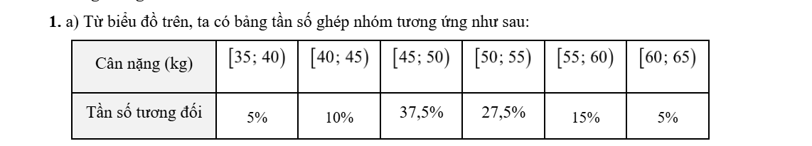Biết rằng có 11 học sinh có cân nặng từ 50 kg đến dưới 55 kg. a) Lập bảng tần số ghép nhóm tương ứng.