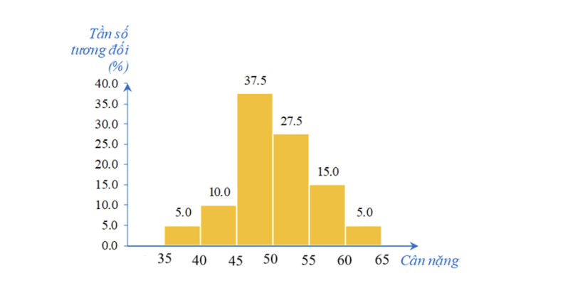 Biểu đồ dưới đây biểu diễn tỉ lệ về cân nặng của các bạn học sinh lớp 9A (đơn vị: kg).