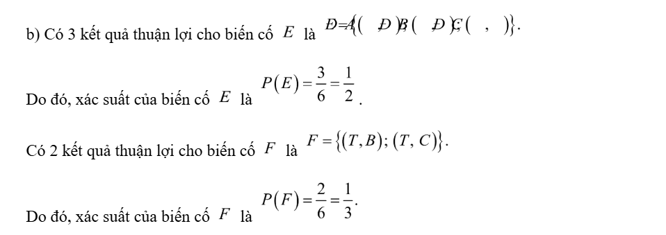 Bạn Hoàng lấy ngẫu nhiên một quả cầu từ một túi đựng 2 quả cầu gồm một quả màu đen và một quả cầu màu trắng, có cùng khối lượng và kích thước. Bạn Hải rút ngẫu nhiên một tấm thẻ từ một hộp đựng 3 tấm thẻ A, B, C. b) Xét các biến cố sau: E: “Bạn Hoàng lấy được một quả cầu màu đen”; F: “Hoàng lấy được quả cầu màu trắng và bạn Hải không rút được tấm thẻ A”. Tính P(E); P(F) .
