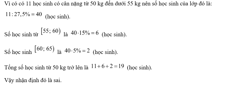 b) Bạn lớp trưởng cho rằng có trên 50% số học sinh của lớp có cân nặng từ 50 kg trở lên. Nhận định đó đúng hay sai? Tại sao?