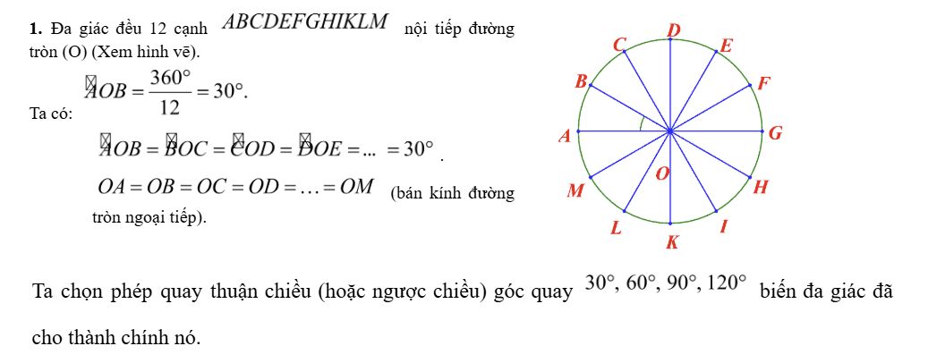 Vòng trong của mái giếng trời hình hoa sen của nhà ga Bến Thành (Thành phố Hồ Chí Minh) có dạng đa giác đều 12 cạnh (hình vẽ). Hãy chỉ ra bốn phép quay biến đa giác đều đó thành chính nó.