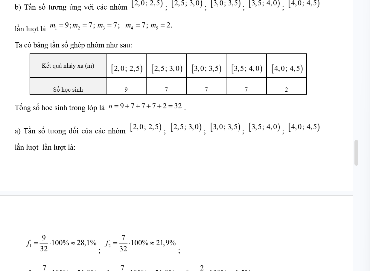 b) Hãy lập bảng số liệu làm 5 nhóm trong đó nhóm cuối cùng cự li là từ 4,0 đến dưới 4,5 m. Lập bảng tần số và tần số tương đối ghép nhóm.