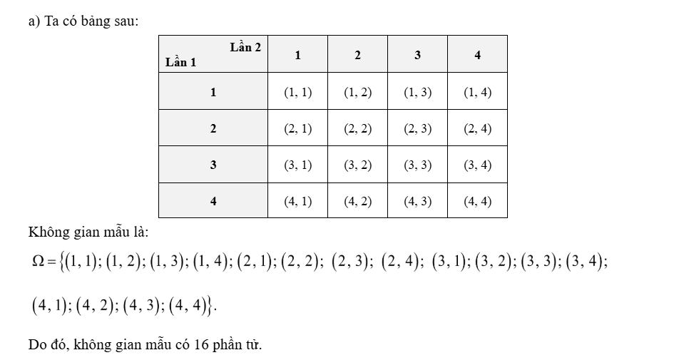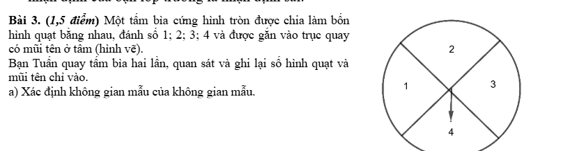 b) Tính xác suất của các biến cố: E: “Tổng hay số ghi trên hai hình quạt ở hai lần quay bằng 5”. F: “Tích hai số ghi trên hai hình quạt ở hai lần quay bằng 4”.