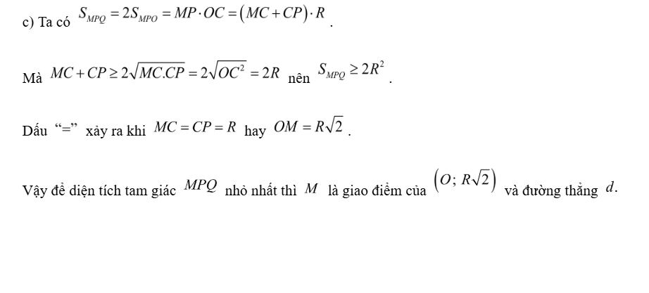 c) Đường thẳng qua O, vuông góc với OM cắt các tia MC, MD theo thứ tự tại P,Q. Tìm vị trí của điểm M trên d sao cho diện tích tam giác MPQ nhỏ nhất.
