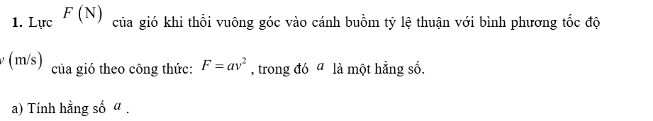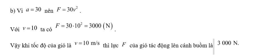 b) Khi tốc độ của gió là v= 10m/s thì lực của gió tác động lên cánh buồm là bao nhiêu?