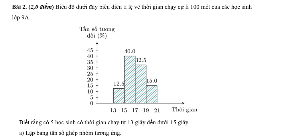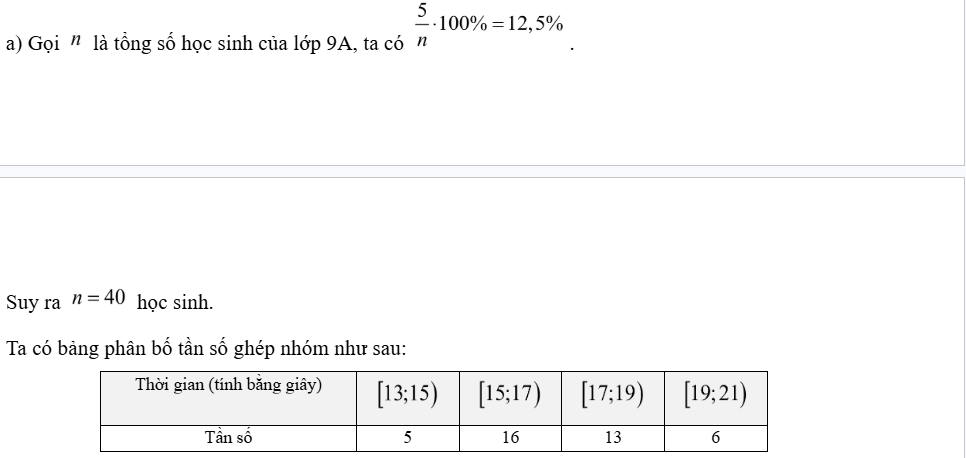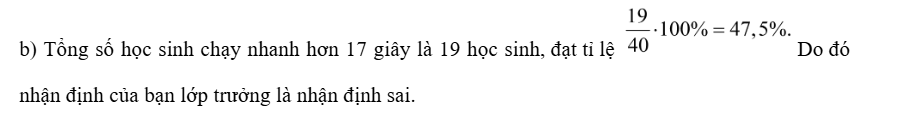 b) Bạn lớp trưởng cho rằng có trên 50% số học sinh của lớp có thời gian chạy nhanh hơn 17 giây. Nhận định đó đúng hay sai? Tại sao?